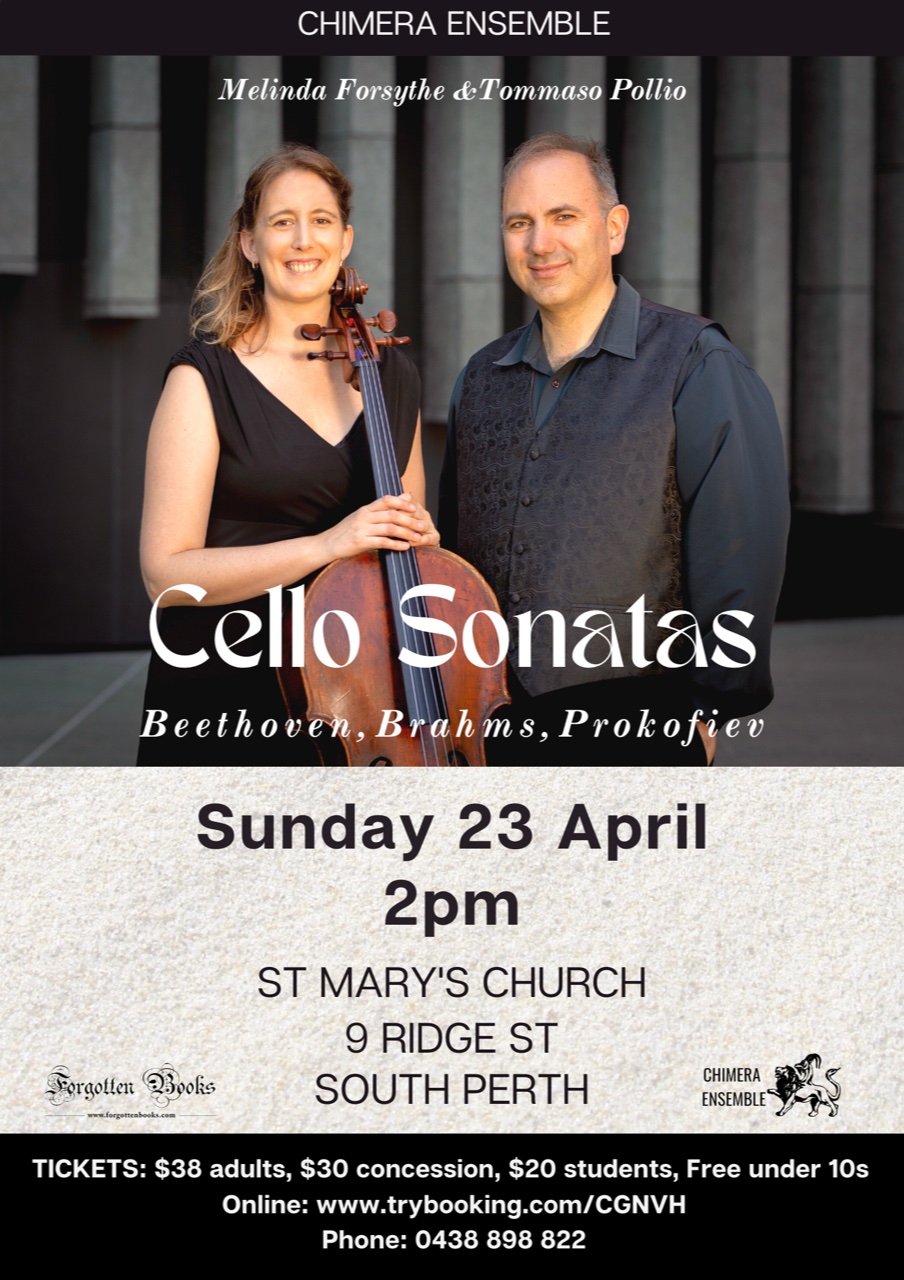 « All Events This event has passed. Cello Sonatas – Beethoven, Brahms, Prokofiev April 23, 2023 @ 2:00 pm - 5:00 pm Event Navigation « Wilfrid Gordon McDonald Partridge Rapunzel » + Google Calendar+ iCal Export Details Date: April 23, 2023 Time: 2:00 pm - 5:00 pm Website: https://chimeraensemble.us13.list-manage.com/track/click?u=e7736ba044d1d920414663f0b&id=7ba3e5fbf6&e=f817d3c7b1 Organizer Chimera Ensemble Phone: (08) 9345 1632 Website: www.chimeraensemble.org.au Venue St Mary’s Curch 9 Ridge Street South Perth, Western Australia Australia + Google Map