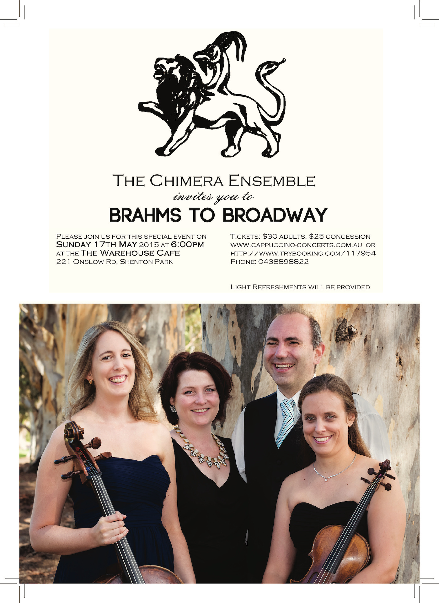 « All Events This event has passed. Chimera Ensemble Brahms to Broadway May 17, 2015 @ 6:00 pm - 7:30 pm Event Navigation « The Druzhba Concert Beethoven: Complete Cello Sonatas » + Google Calendar+ iCal Export Details Date: May 17, 2015 Time: 6:00 pm - 7:30 pm Venue Warehouse Cafe