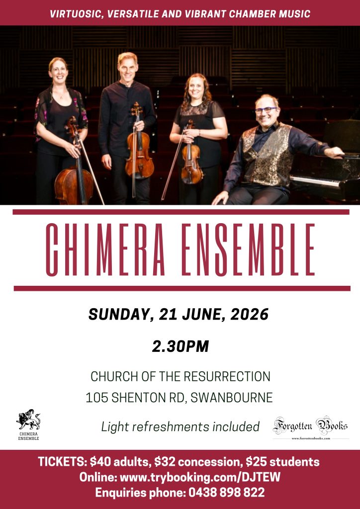 « All Events Chimera Ensemble Presents: Piano Quartets (Mozart, Elfman, Schumann) June 21 @ 2:30 pm - 4:30 pm Event Navigation « West Australian Opera Presents La Traviata West Australian Opera Presents Eugene Onegin » + Google Calendar+ iCal Export Details Date: June 21 Time: 2:30 pm - 4:30 pm Organizer Chimera Ensemble Phone: (08) 9345 1632 Website: www.chimeraensemble.org.au Venue Church of the Resurrection 105 Shenton Road Swanbourne, WA Australia + Google Map