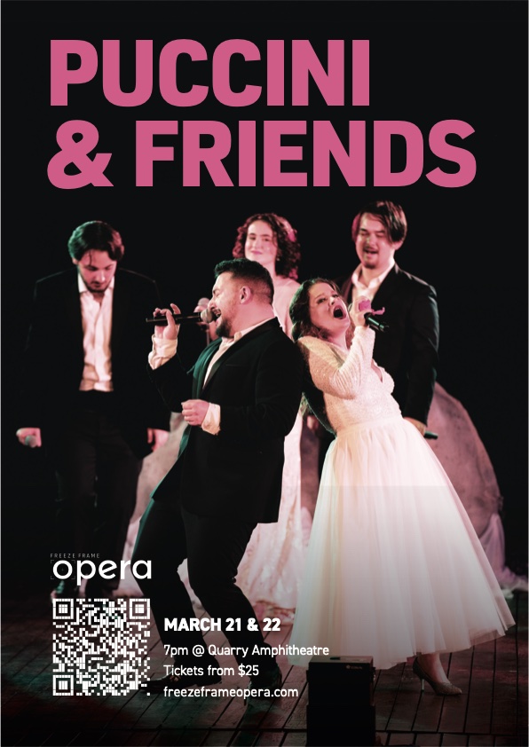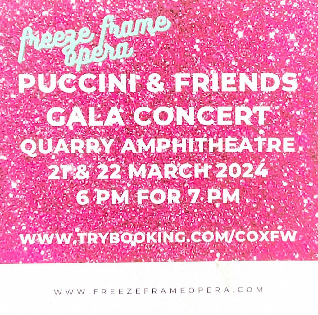 « All Events This event has passed. Freeze frame Opera: Puccini & Friends March 21, 2024 @ 6:00 pm - 9:00 pm|Recurring Event (See all)One event on March 22, 2024 at 6:00pm Event Navigation « Rapunzel The Marriage of Figaro » + Google Calendar+ iCal Export Details Date: March 21, 2024 Time: 6:00 pm - 9:00 pm Website: http://www.trybooking.com/coxfw Organizer Freeze Frame Opera Email: freezeframeopera@gmail.com Website: http://www.freezeframeopera.com/ Venue Quarry Ampitheater City Beach 1 Waldron Dr, City Beach WA Perth, Western Australia 6015 Australia + Google Map Phone: (08) 9385 7144 Website: https://www.quarryamphitheatre.com.au/Home