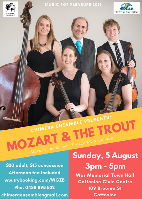 Join Chimera Ensemble for the Town of Cottesloe’s 2018 Music For Pleasure Concert as they perform Mozart’s Piano Quartet No 1, Jayakumar’s Suite for Quintet from the opera ‘Beyond the Wall’, Piazzolla’s Libertango and the effervescent favourite ‘Trout Quintet’ by Schubert.