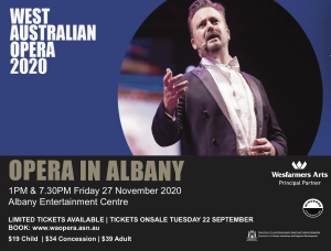 Opera in Albany Be moved by the powerful voices of West Australian Opera artists and sing along to showstopping arias in a concert of well-known operatic hits. This is an event experience for the entire family to enjoy. 1pm & 7.30pm Friday 27 November 2020 Albany Entertainment Centre $39 Adult | $34 Concession | $19 Child | $99 Family Opera in Albany is proudly supported by WAO Principal Partner Wesfarmers Arts, Minderoo Foundation, Department of Local Government, Sport and Cultural…