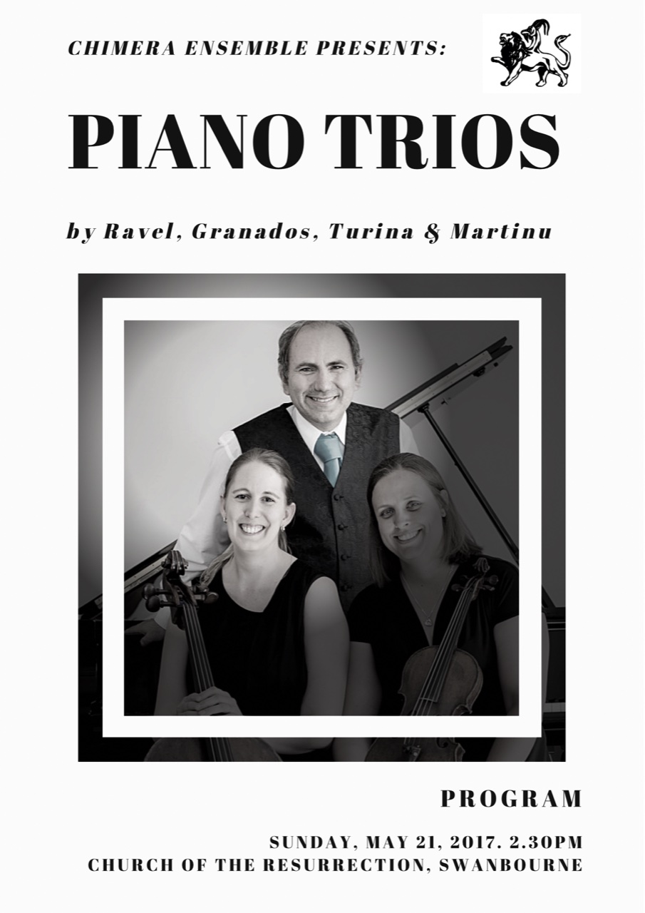 « All Events This event has passed. Piano Trios May 21, 2017 @ 2:30 pm - 5:00 pm Event Navigation « 2017 Chimera Ensemble Brochure A Chamber Musical Journey » + Google Calendar+ iCal Export Details Date: May 21, 2017 Time: 2:30 pm - 5:00 pm