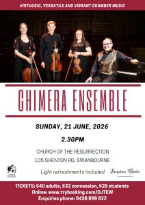 ← Back to Events Church of the Resurrection + Google Map 105 Shenton Road Swanbourne, WA Australia Upcoming Events Events List Navigation « Previous Events June 2026 Chimera Ensemble Presents: Piano Quartets (Mozart, Elfman, Schumann) June 21 @ 2:30 pm - 4:30 pm Church of the Resurrection, 105 Shenton Road Swanbourne, WA Australia + Google Map Find out more » + Export Events