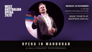 Opera in Mandurah Be moved by the powerful voices of West Australian Opera artists and sing along to showstopping arias in a concert of well-known operatic hits. This is an event experience for the entire family to enjoy. 11am Monday 23 November 2020 Boardwalk Theatre | Mandurah Performing Arts Centre. $39 Adult | $34 Concession | $19 Child | $99 Family Opera in Mandurah is proudly supported by WAO Principal Partner Wesfarmers Arts, Minderoo Foundation, Department of Local Government, Sport…